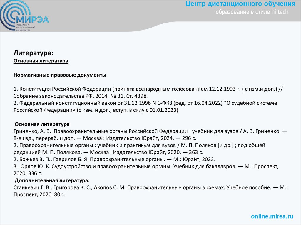 2. Божьев В. П., Гаврилов Б. Я. Правоохранительные органы. — М.: Юрайт, 2023.