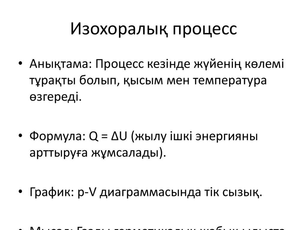 Изохоралық процесс• Анықтама: Процесс кезінде жүйенің көлемі