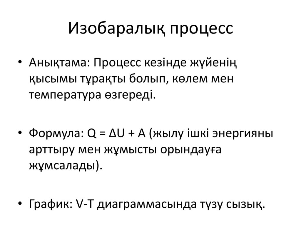 • Формула: Q = ∆U + A (жылу ішкі энергияны