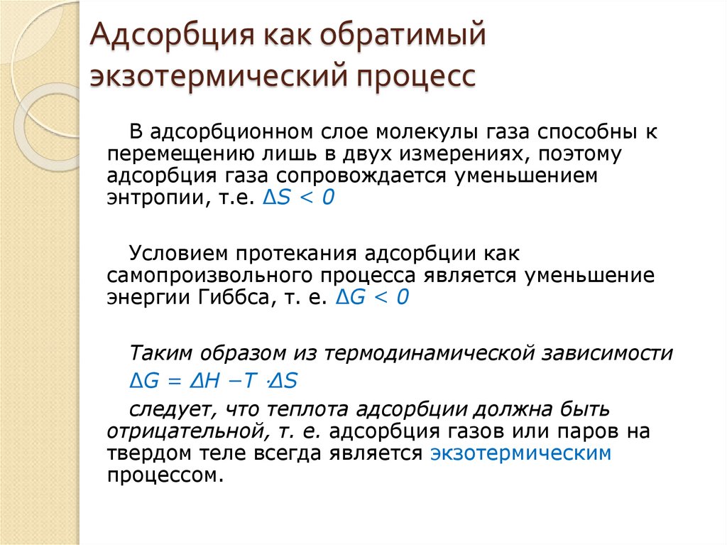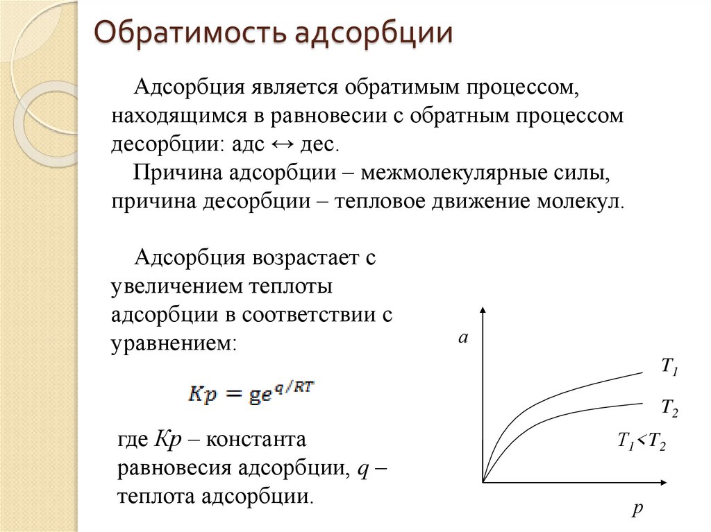 Адсорбция является обратимым процессом,находящимся в равновесии с обратным процессом