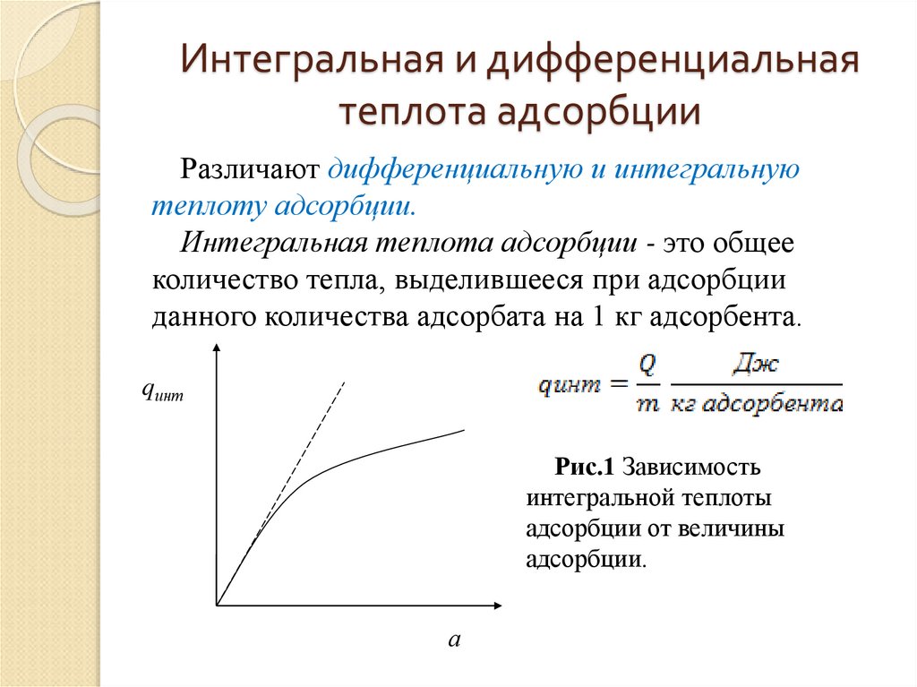 Различают дифференциальную и интегральнуютеплоту адсорбции.