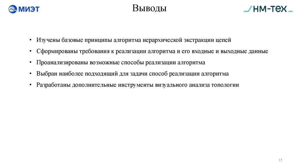 Выводы• Изучены базовые принципы алгоритма иерархической экстракции цепей
