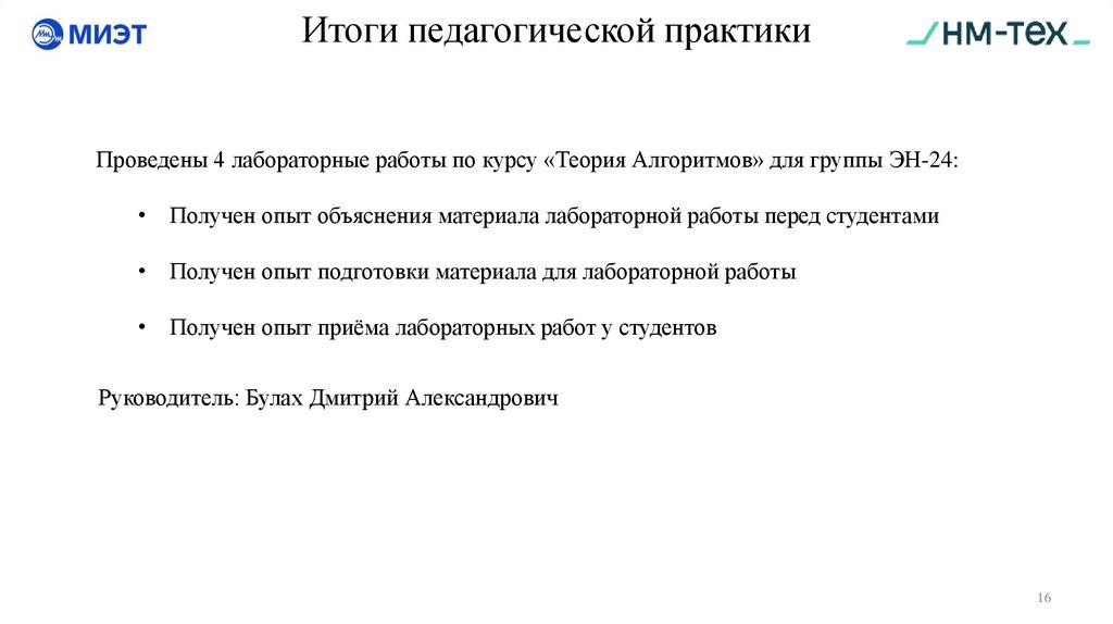 Итоги педагогической практикиПроведены 4 лабораторные работы по курсу «Теория Алгоритмов» для группы ЭН-24: