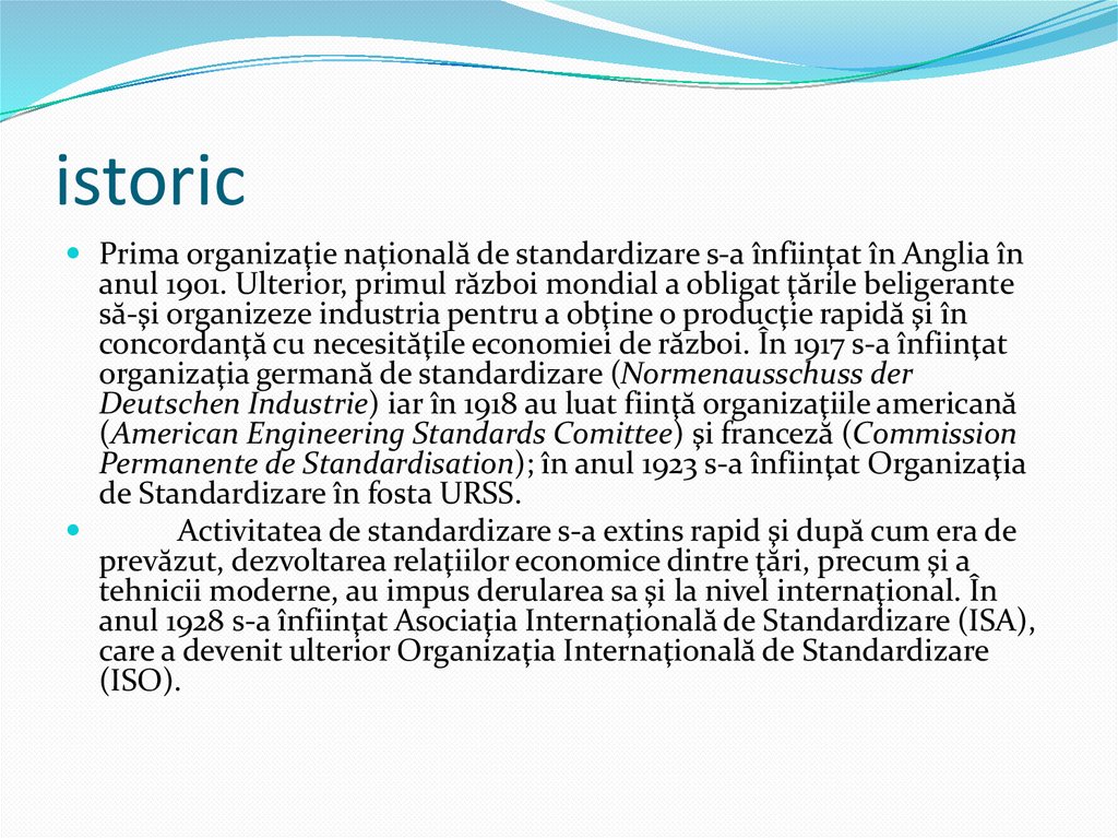 istoricPrima organizaţie naţională de standardizare s-a înfiinţat în Anglia în