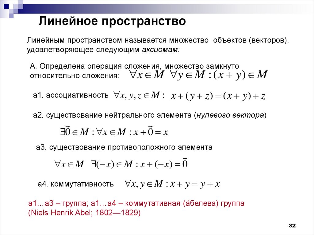 Линейным пространством называется множество объектов (векторов),удовлетворяющее следующим аксиомам: