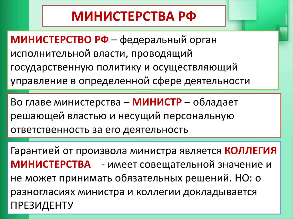 МИНИСТЕРСТВА И ВЕДОМСТВАРФ: ПОНЯТИЕ, ПРАВОВОЙ