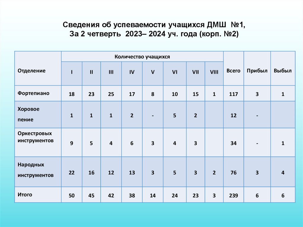 Сведения об успеваемости учащихся ДМШ №1,За 2 четверть 2023– 2024 уч. года (корп. №2)