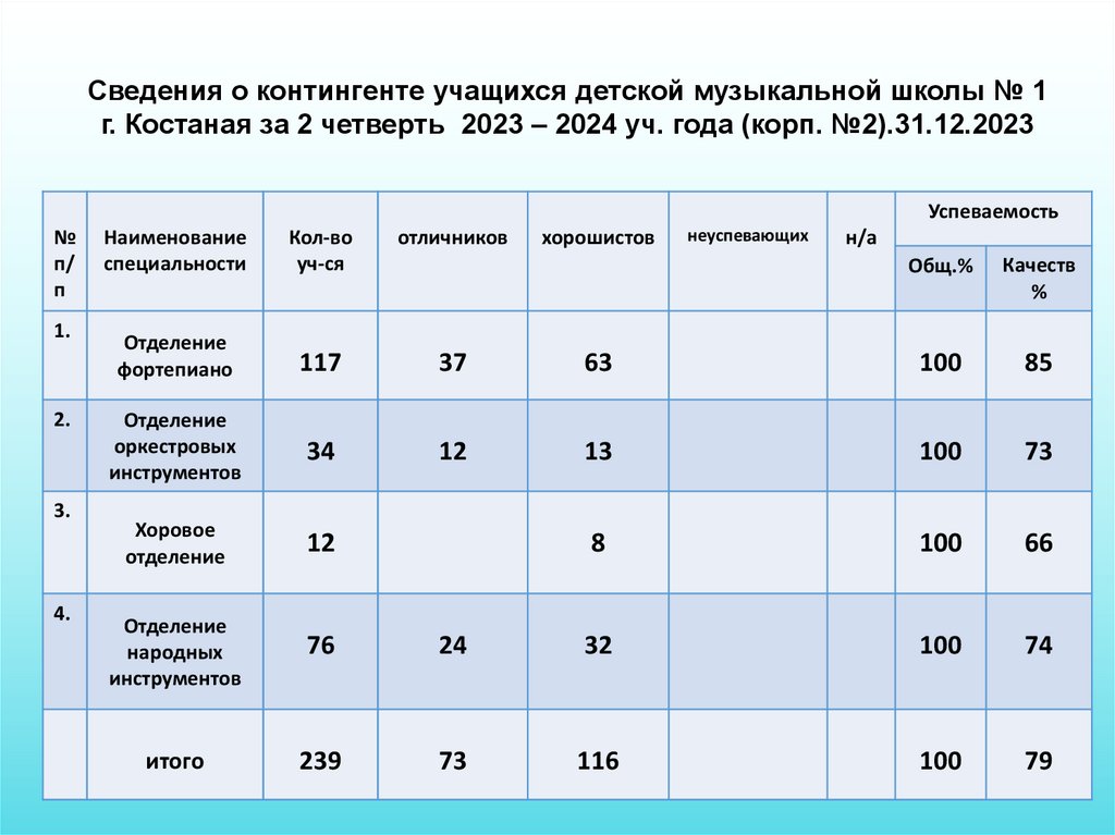 Сведения о контингенте учащихся детской музыкальной школы № 1г. Костаная за 2 четверть 2023 – 2024 уч. года (корп. №2).31.12.2023