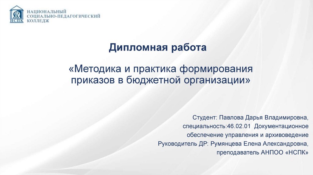 • Объект: Методы и принципы разработки приказов в бюджетном учреждении.