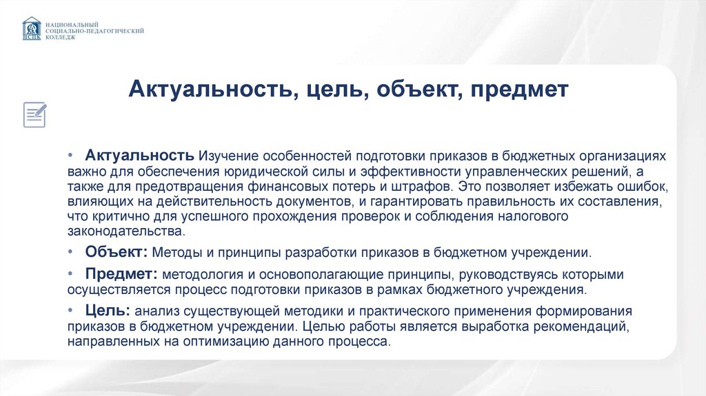 Актуальность, цель, объект, предмет• Актуальность Изучение особенностей подготовки приказов в бюджетных организациях