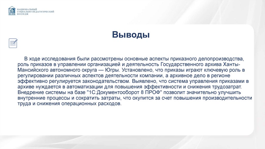 ВыводыВ ходе исследования были рассмотрены основные аспекты приказного делопроизводства,