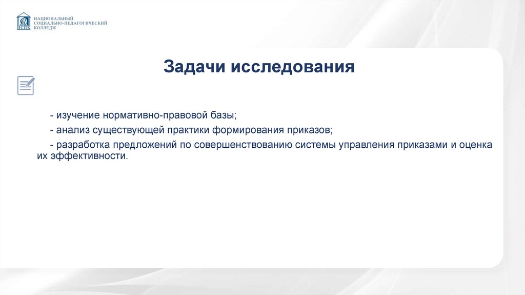Задачи исследования- изучение нормативно-правовой базы;