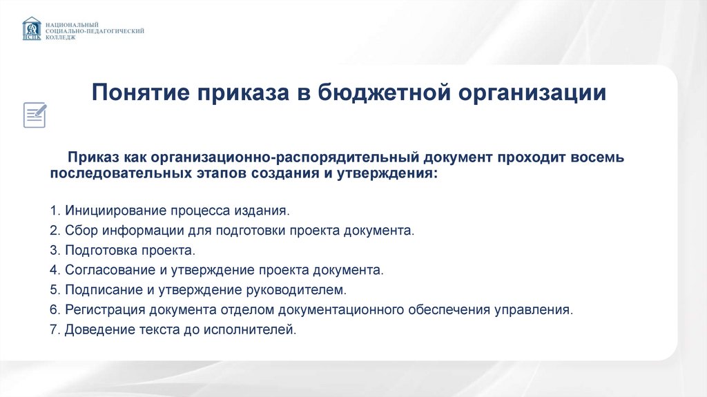 Понятие приказа в бюджетной организацииПриказ как организационно-распорядительный документ проходит восемь