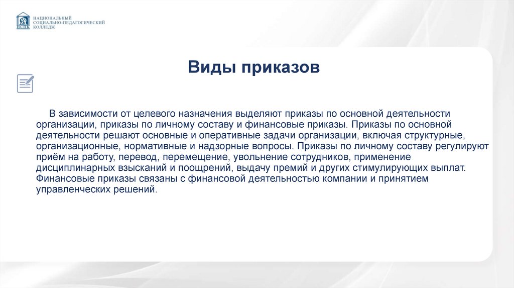 Виды приказовВ зависимости от целевого назначения выделяют приказы по основной деятельности