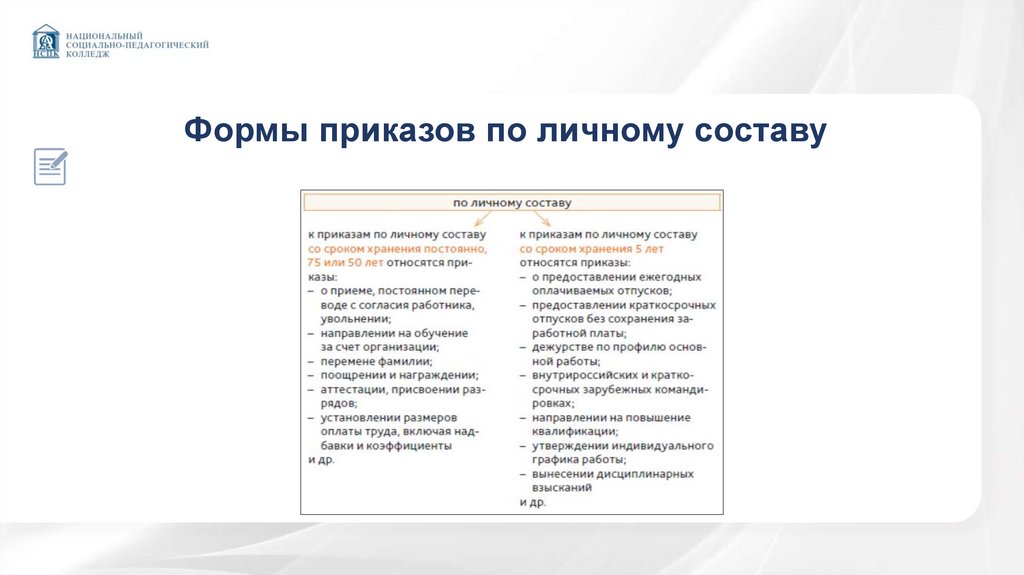 организационные, нормативные и надзорные вопросы. Приказы по личному составу регулируют