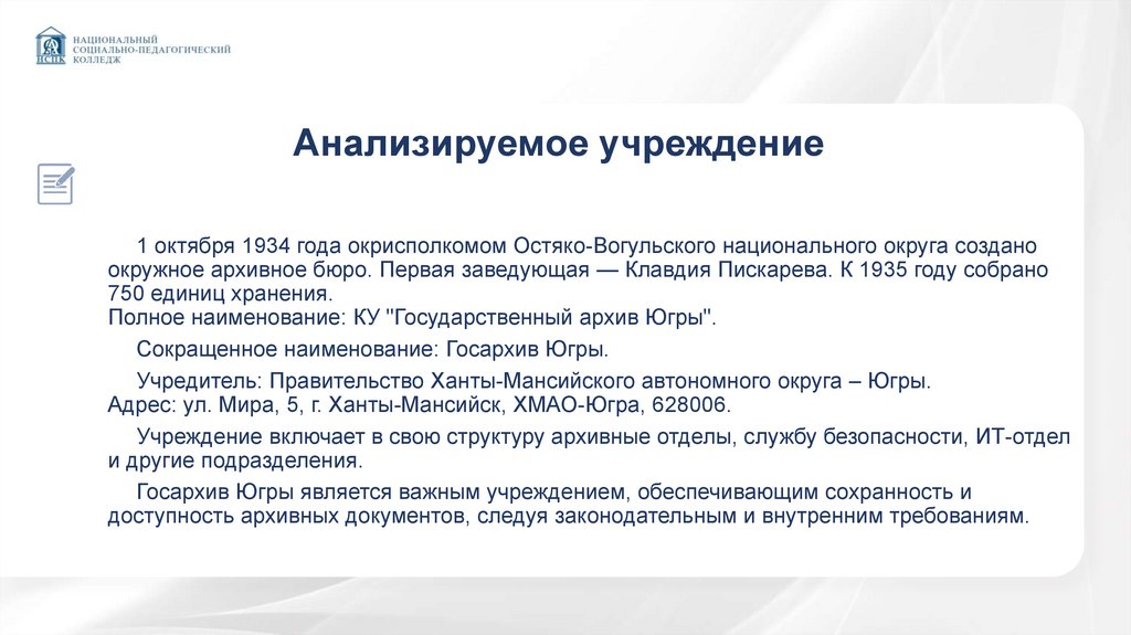 Анализируемое учреждение1 октября 1934 года окрисполкомом Остяко-Вогульского национального округа создано