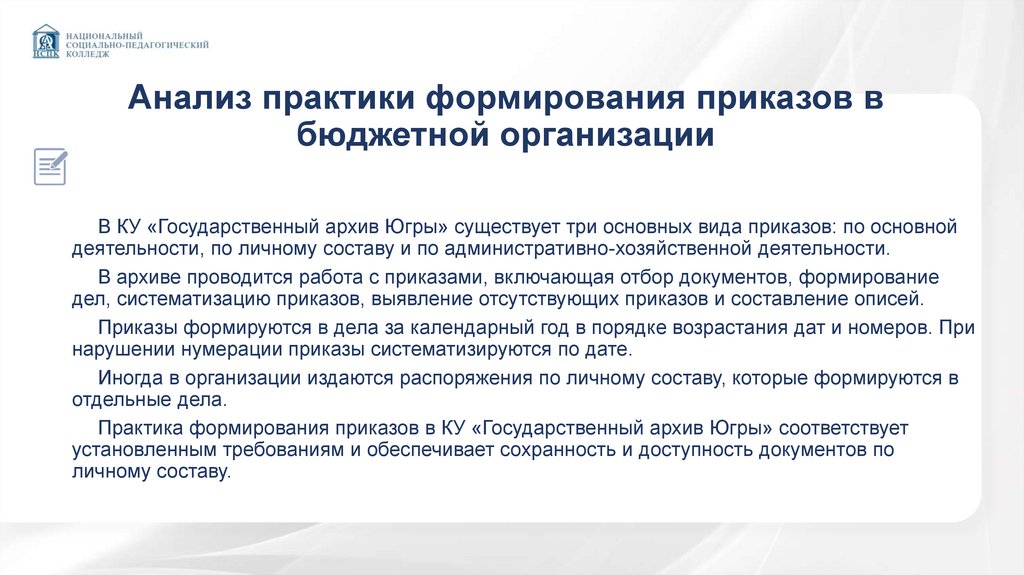 Анализ практики формирования приказов вбюджетной организации