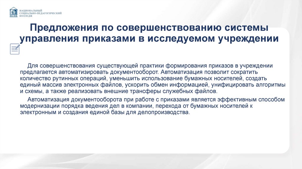 Предложения по совершенствованию системыуправления приказами в исследуемом учреждении