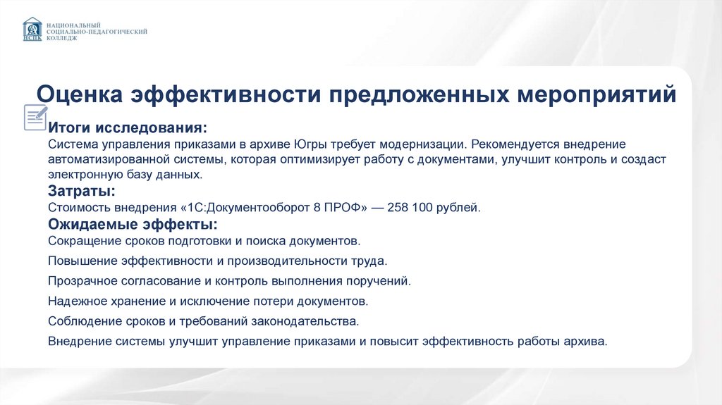 Оценка эффективности предложенных мероприятийИтоги исследования: