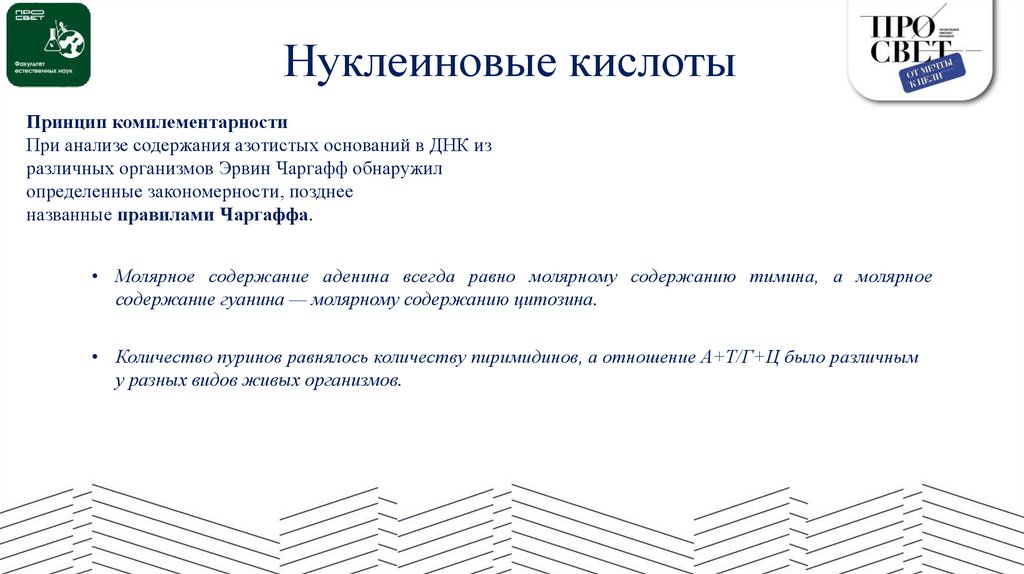 • Количество пуринов равнялось количеству пиримидинов, а отношение А+Т/Г+Ц было различным