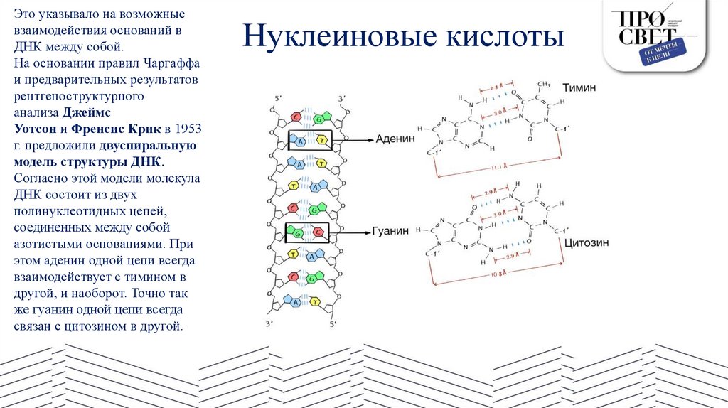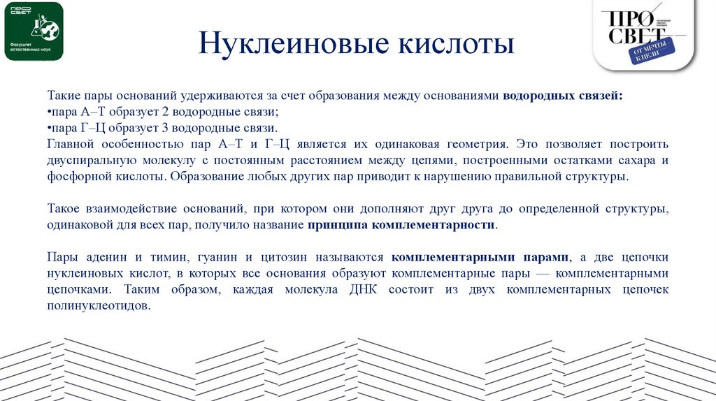 Нуклеиновые кислотыТакие пары оснований удерживаются за счет образования между основаниями водородных связей: