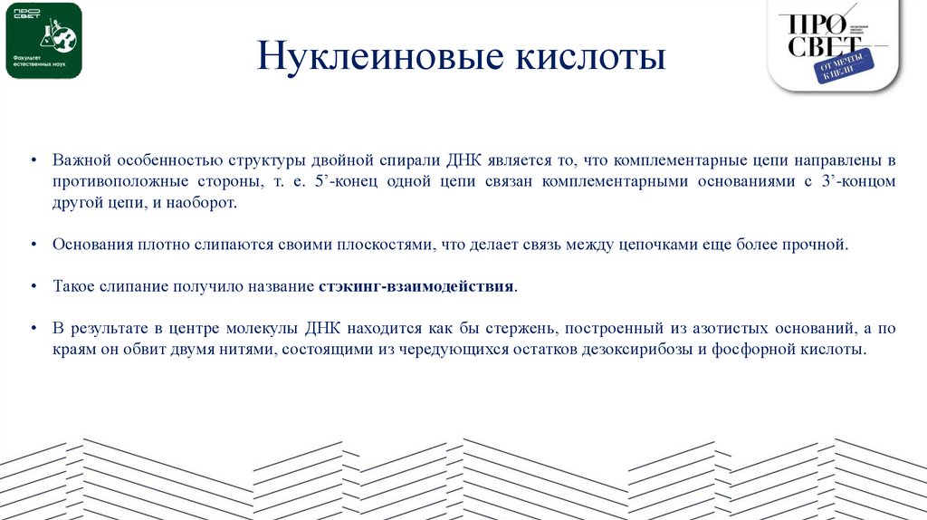 Нуклеиновые кислоты• Важной особенностью структуры двойной спирали ДНК является то, что комплементарные цепи направлены в