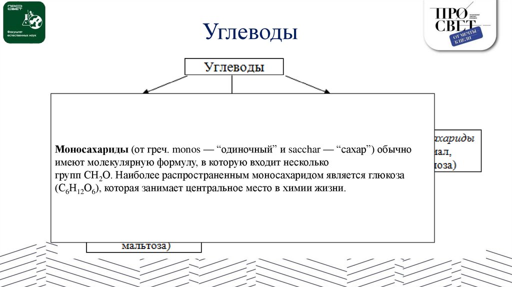 УглеводыМоносахариды (от греч. monos — “одиночный” и sacchar — “сахар”) обычно
