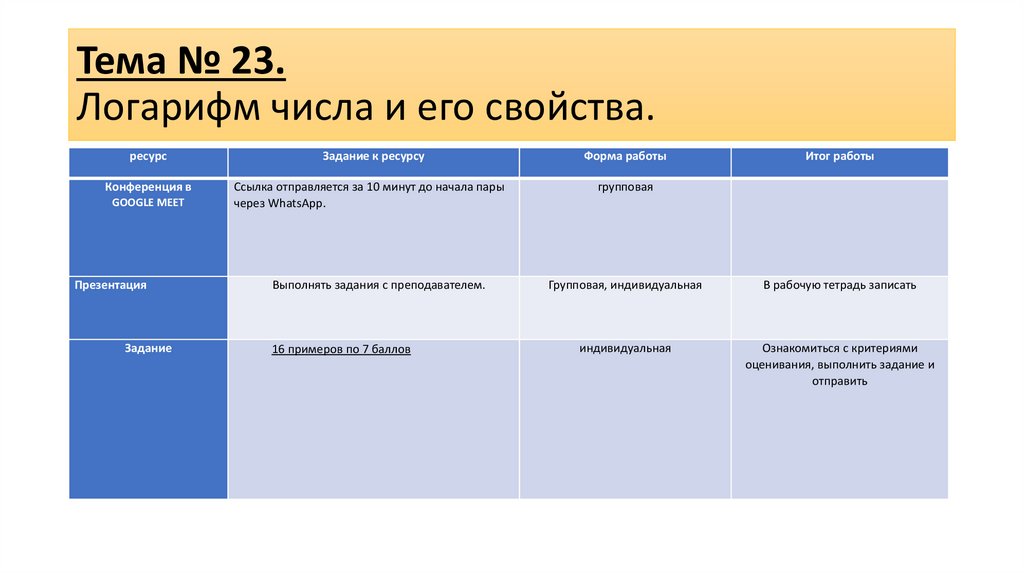 Тема № 23.Логарифм числа и его свойства.