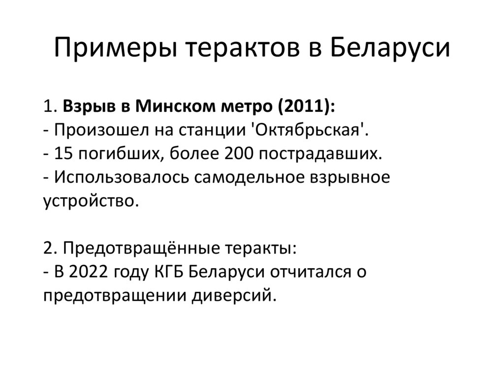 Примеры терактов в Беларуси1. Взрыв в Минском метро (2011):