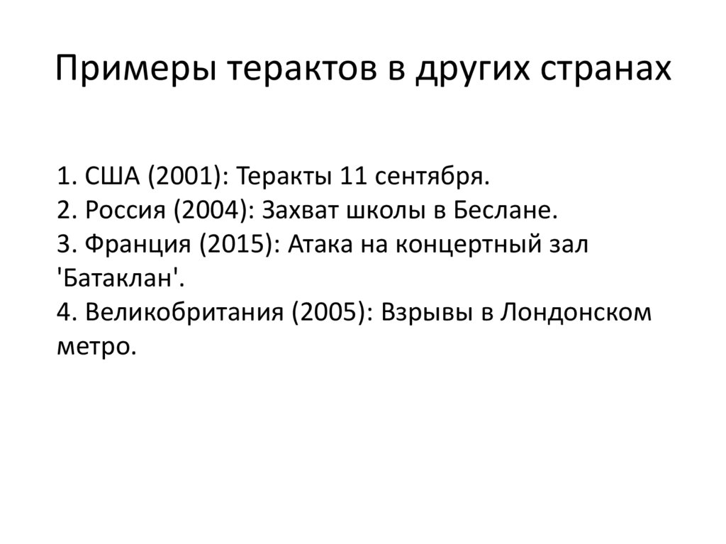Примеры терактов в других странах1. США (2001): Теракты 11 сентября.
