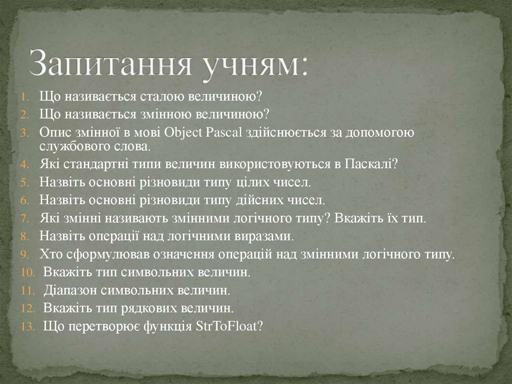 1. Що називається сталою величиною?2. Що називається змінною величиною?