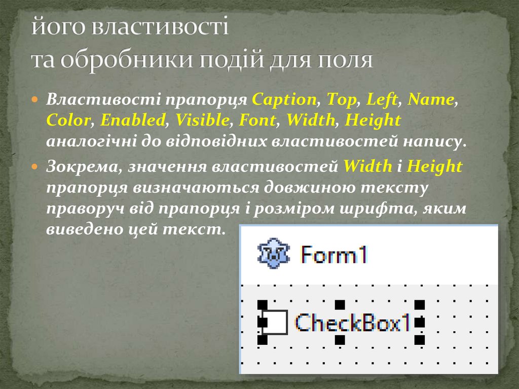 Розглянемо компонент прапорець. Значеннядеяких його властивостей, зокрема властивості