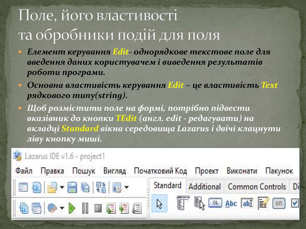 Елемент керування Edit- однорядкове текстове поле длявведення даних користувачем і виведення результатів