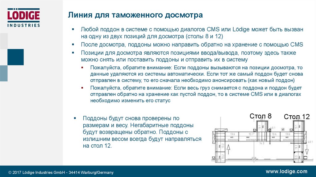 Линия для таможенного досмотраЛюбой поддон в системе с помощью диалогов CMS или Lödige может быть вызван
