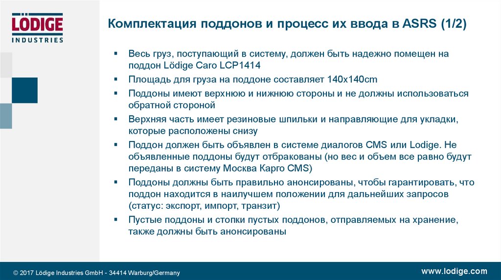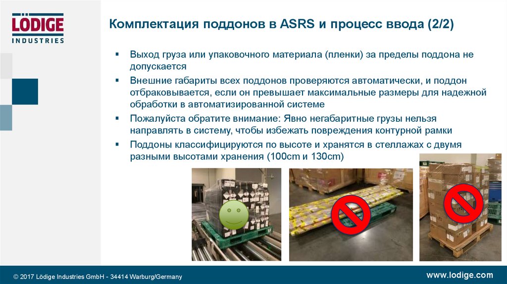 Комплектация поддонов и процесс их ввода в ASRS (1/2)Весь груз, поступающий в систему, должен быть надежно помещен на
