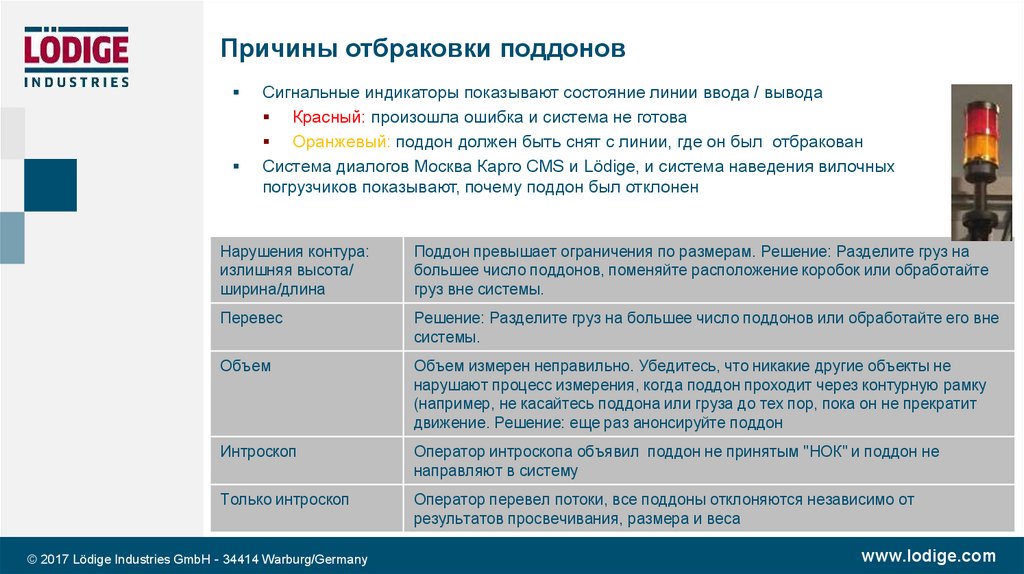 Причины отбраковки поддоновСигнальные индикаторы показывают состояние линии ввода / вывода