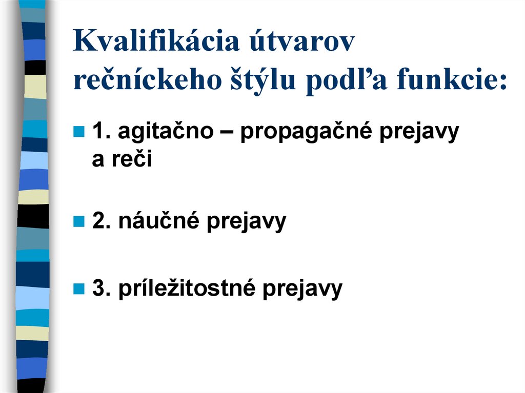 11. Kvalifikácia útvarov rečníckeho štýlu podľa funkcie: