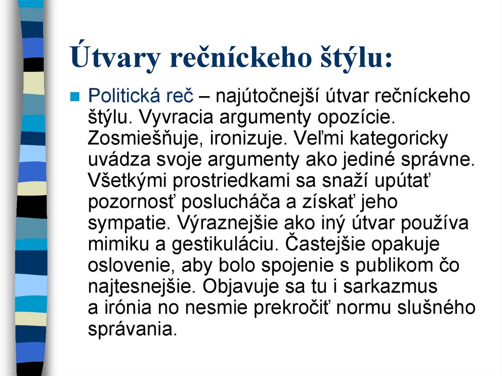 Politická reč – najútočnejší útvar rečníckehoštýlu. Vyvracia argumenty opozície.