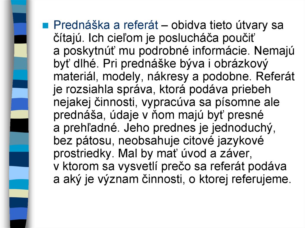 Prednáška a referát – obidva tieto útvary sačítajú. Ich cieľom je poslucháča poučiť