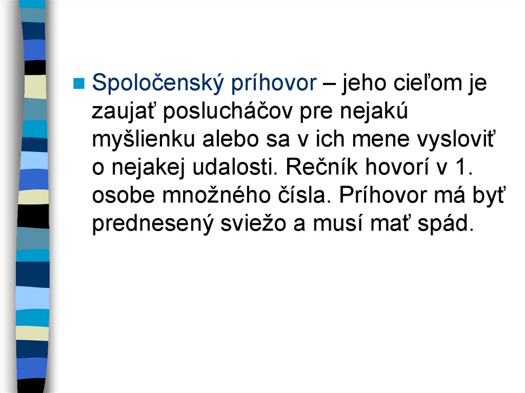 Spoločenský príhovor – jeho cieľom jezaujať poslucháčov pre nejakú