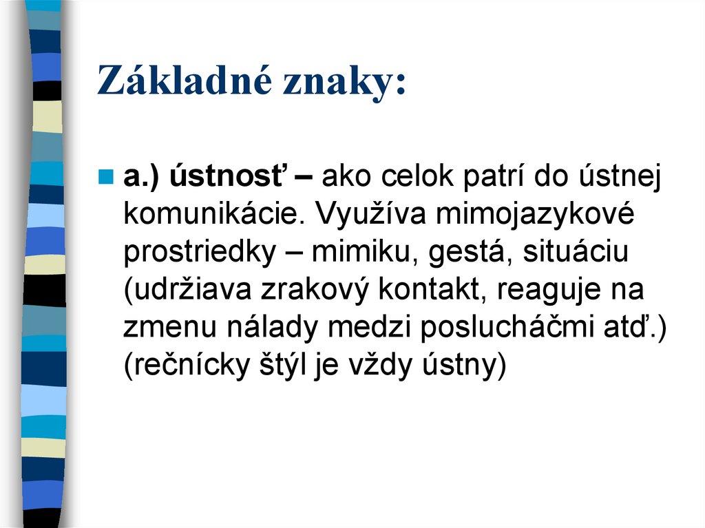 a.) ústnosť – ako celok patrí do ústnejkomunikácie. Využíva mimojazykové