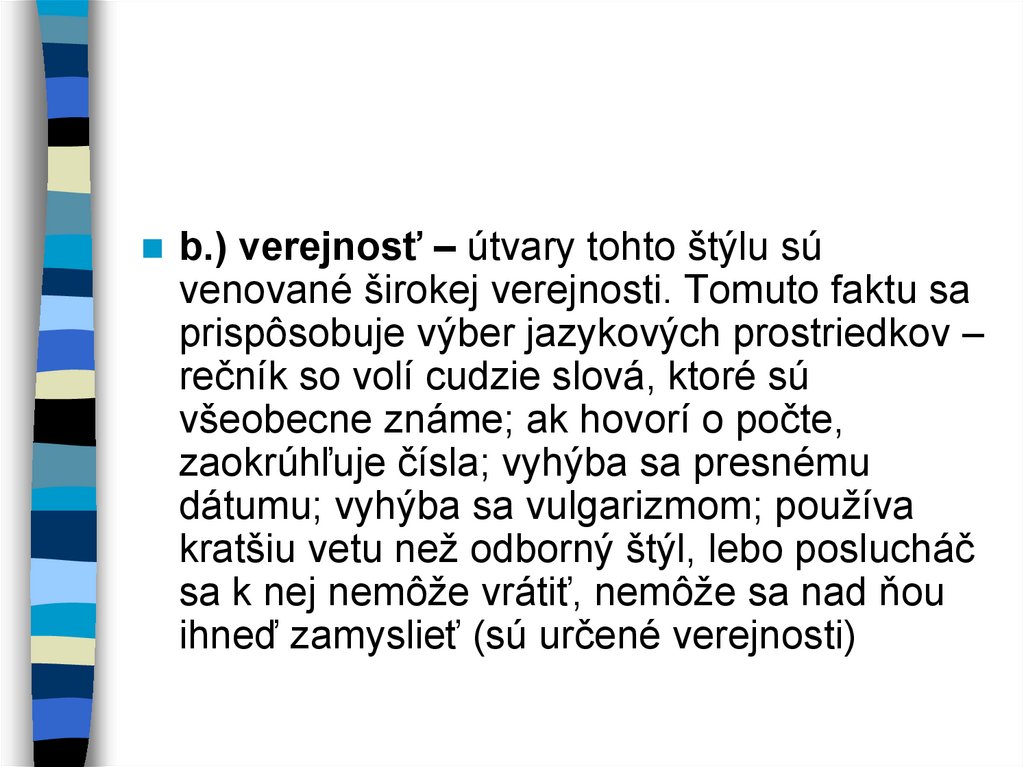 b.) verejnosť – útvary tohto štýlu súvenované širokej verejnosti. Tomuto faktu sa