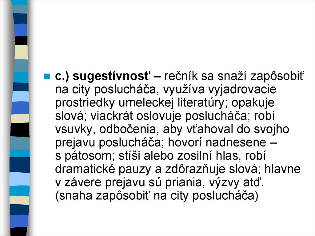 c.) sugestívnosť – rečník sa snaží zapôsobiťna city poslucháča, využíva vyjadrovacie