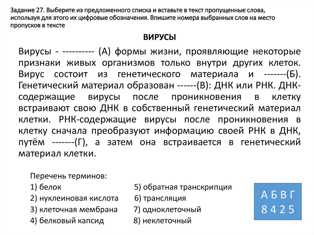 39. Задание 27. Выберите из предложенного списка и вставьте в текст пропущенные слова, используя для этого их цифровые обозначения.