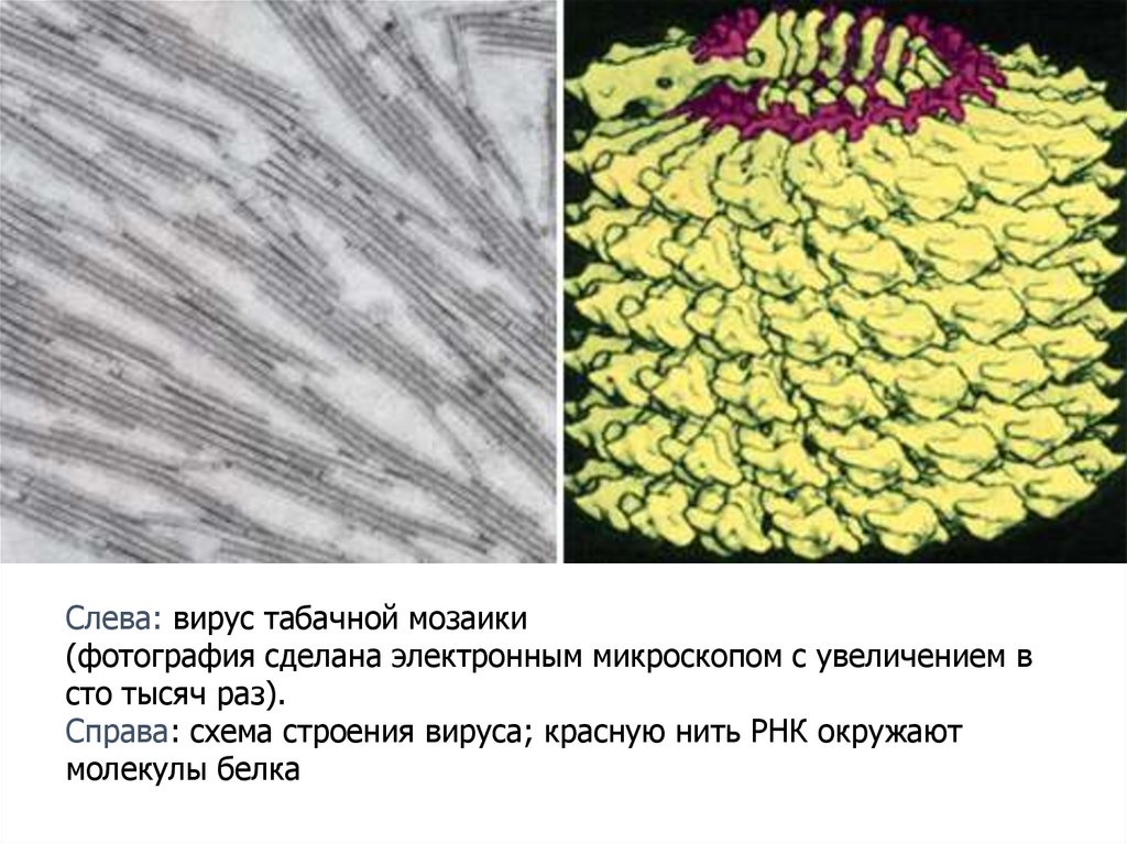 Слева: вирус табачной мозаики(фотография сделана электронным микроскопом с увеличением в