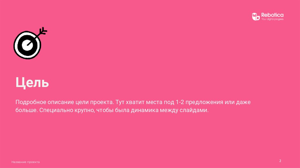ЦельПодробное описание цели проекта. Тут хватит места под 1-2 предложения или даже