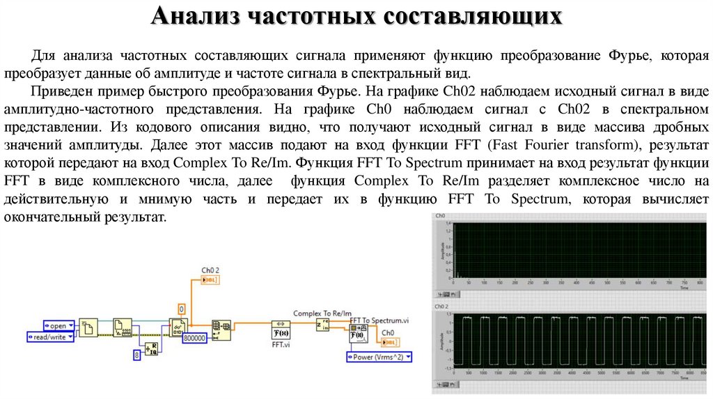Приведен пример быстрого преобразования Фурье. На графике Ch02 наблюдаем исходный сигнал в виде
