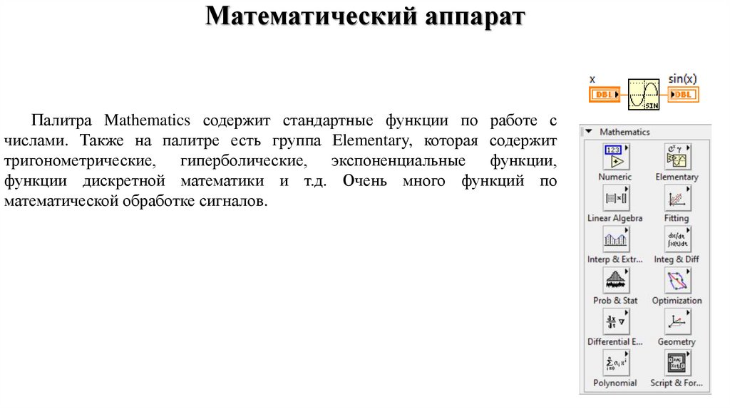 Математический аппаратПалитра Mathematics содержит стандартные функции по работе с