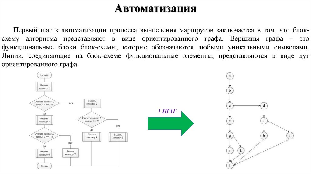 АвтоматизацияПервый шаг к автоматизации процесса вычисления маршрутов заключается в том, что блоксхему алгоритма представляют в виде ориентированного графа. Вершины графа – это