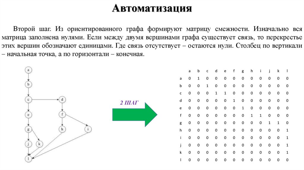 АвтоматизацияВторой шаг. Из ориентированного графа формируют матрицу смежности. Изначально вся